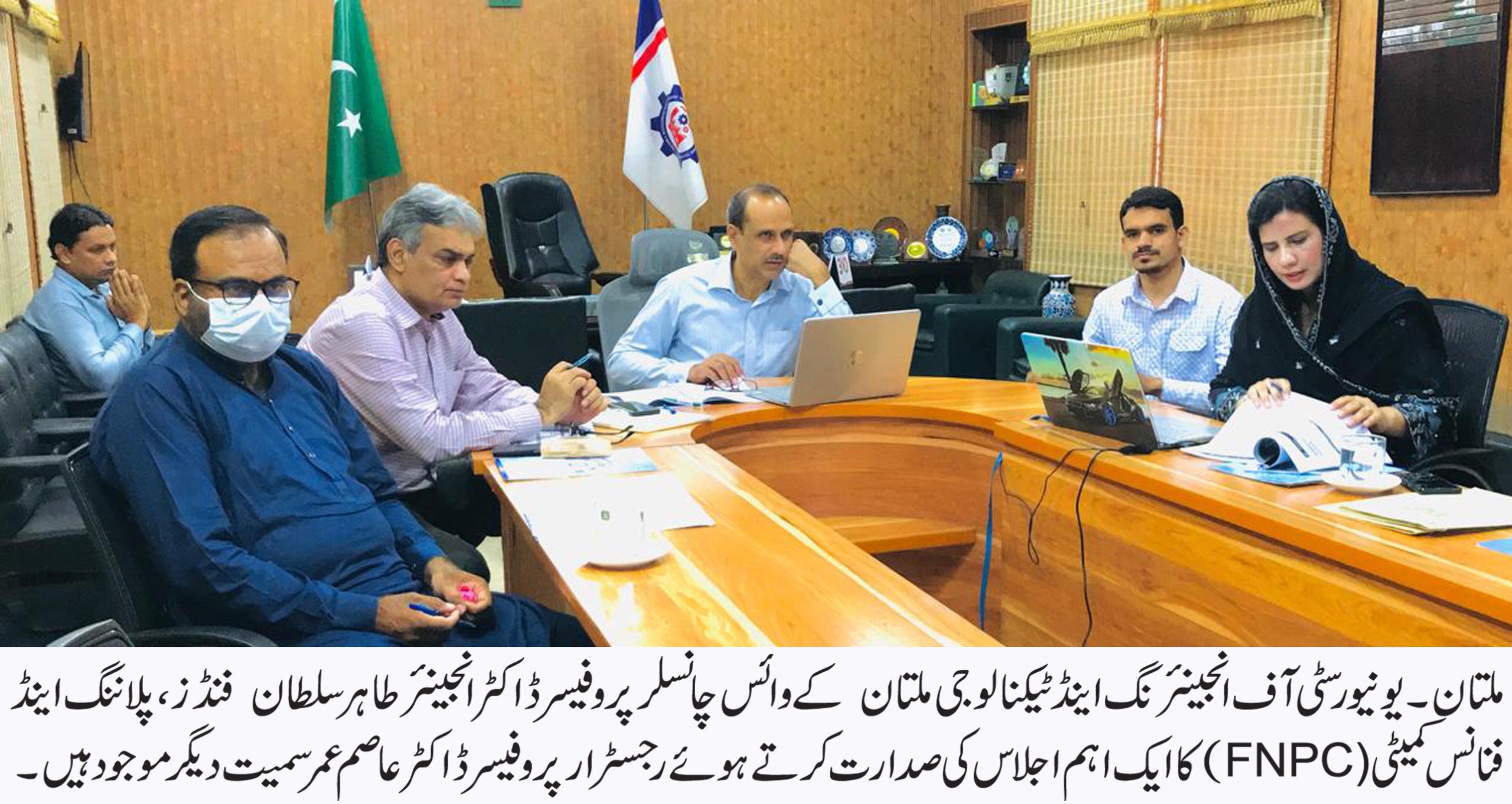 ملتان (صبح پاکستان) ایم این ایس یونیورسٹی آف انجینئرنگ اینڈ ٹیکنالوجی ملتان میں فنڈز، پلاننگ اینڈ فنانس کمیٹی (FNPC) کا ایک اہم اجلاس گزشتہ صبح گیارہ بجے یونیورسٹی کے کانفرنس روم میں منعقد ہوا۔ اجلاس کی صدارت یونیورسٹی کے وائس چانسلر پروفیسر ڈاکٹر انجینئر طاہر سلطان نے کی۔