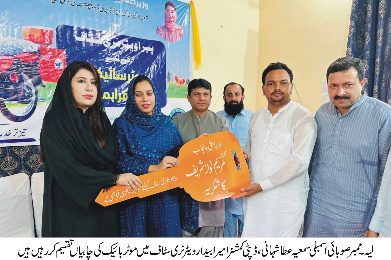 لیہ۔( صبح پاکستان ) وزیراعلی پنجاب مریم نوازشریف کا لائیوسٹاک کے لیے انقلابی اقدام۔جانوروں کی بروقت ویکسی نیشن،دیہی معیشت کو مزیدبہتر کرنے کے لیے محکمہ لائیوسٹاک لیہ کو 90موٹربائیک فراہم کردی گئیں۔بائیک کی فراہمی سے پیرا ویٹرنری سٹاف لائیوسٹاک سروسز کو عام آدمی کی دہلیز تک پہنچاسکیں گے۔ تفصیل کے مطابق موٹربائیک فراہمی کی تقریب محکمہ لائیوسٹا ک کے آفس میں منعقدہوئی ۔تقریب میں ممبرصوبائی اسمبلی سمعیہ عطا شہانی، ڈپٹی کمشنر امیرا بیدار نے ویٹرنری سٹاف میں موٹر بائیک کی چابیاں تقسیم کیں۔ ایڈیشنل ڈپٹی کمشنر ریونیو شاہد ملک، ایڈیشنل ڈائریکٹر لائیو سٹاک ڈاکٹر محمد طارق گدارہ و دیگر افسران بھی اس موقع پر موجود تھے۔ ایم پی اے سمعیہ عطا شہانی نے تقریب سے خطاب کرتے ہوئے کہا کہ وزیر اعلیٰ پنجاب مریم نواز شریف کی قیادت میں پنجاب ترقی کر رہا ہے ہر شعبہ کو ترقی کے لئے وسائل فراہم کئے جا رہے ہیں اور ویٹرنری سٹاف کو موٹر بائیک کی فراہمی لائیو سٹاک کے شعبہ میں انقلابی قدم ہے۔ایم پی اے نے کہاکہ بائیک کی فراہمی سے ویٹرنری سٹاف کو ویکسینیشن، سرویلنس، مصنوعی نسل کشی اور دیگر ویٹرنری سروسز کی بروقت فراہمی میں آسانی ہو گی بلکہ دور دراز علاقوں تک علاج اور دیگر طبی خدمات کو بہتر بنایا جا سکے گا۔ ڈپٹی کمشنر امیرا بیدار نے تقریب سے خطاب کرتے ہوئے کہا کہ لائیو سٹاک کا شعبہ پنجاب کی معیشت میں اہم کردار ادا کر رہا ہے۔ وزیر اعلیٰ پنجاب کی طرف سے مویشی پال حضرات کے جانوروں کے علاج معالجے کے لئے سٹاف کو موٹر بائیک فراہم کی گئی ہیں تاکہ ان کے جانوروں کا بروقت علاج ہو سکے اور وہ مالی نقصان سے بچ سکیں۔ ایڈیشنل ڈائریکٹر لائیو سٹاک ڈاکٹر محمد طارق گدارہ نے کہا کہ محکمہ لائیو سٹاک ضلع بھر میں سروسز کی فراہمی کے لئے بھرپور اقدامات کر رہا ہے۔ انہوں نے کہا کہ موٹر بائیک کی فراہمی سے سٹاف کو فیلڈ ڈیوٹی میںبھی آسانی رہے گی۔تقریب کے اختتام پرویٹرنری سٹاف نے حکومت پنجاب اور محکمہ لائیوسٹاک کا شکریہ ادا کیا اور مویشی پال حضرات کو بروقت لائیوسٹاک سروسز فراہم کرنے کے عزم کا اظہار کیا۔