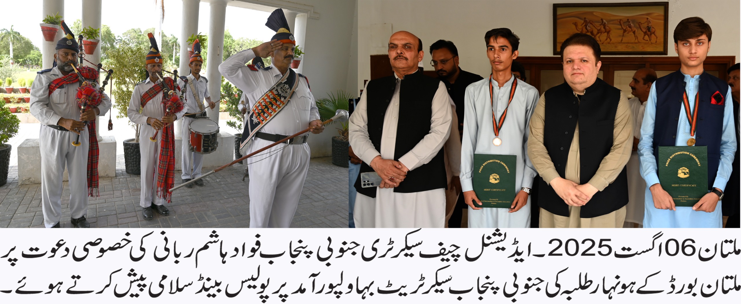 ایڈیشنل چیف سیکرٹری نے اس موقع پر گفتگو کرتے ہوئے کہا کہ "ہارون حامد اور حافظ عبداللہ جیسے ہونہار طلبہ جنوبی پنجاب کا فخر ہیں۔ یہ نوجوان مستقبل میں پاکستان کے روشن ستارے بنیں گے۔ جنوبی پنجاب کے ہونہار طلبہ و طالبات ملک و قوم کا اصل سرمایہ ہیں۔ نوجوان نسل کی کامیابیاں ہمارے روشن مستقبل کی ضمانت ہیں۔ جنوبی پنجاب سیکرٹریٹ ہر شعبے میں ابھرتے ہوئے ٹیلنٹ کی بھرپور سرپرستی اور حوصلہ افزائی جاری رکھے گا۔”