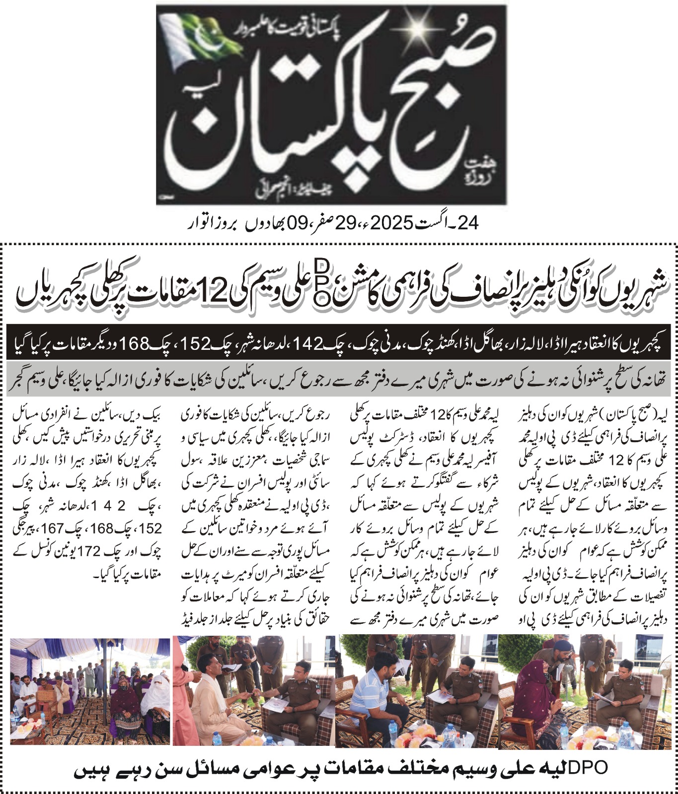 شہریوں کو ان کی دہلیز پر انصاف کی فراہمی کےلئے ڈی پی او لیہ محمد علی وسیم کا 12 مختلف مقامات پر کھلی کچہریوں کا انعقاد