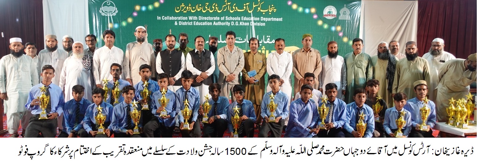 ڈیرہ غا زیخان ( صبح پاکستان ): آقائے دوجہاں حضرت محمد صلی اللّہ علیہ وآلہ وسلّم کے 1500 سالہ جشن ولادت کے سلسلے میں آرٹس کونسل میں ایک با وقار اور روح پرور تقاریب کا انعقاد کیا گیا۔ ڈائریکٹوریٹ ایجوکیشن ڈی جی خان ڈویژن اور ڈسٹرکٹ ایجوکیشن اتھارٹی کے اشتراک سے عشرہ رحمت اللعالمین کے سلسلے میں جاری تحصیل، ضلع کے ونرز کے درمیان ڈویژنل مقابلہ جات کی اس تقریب کی میزبانی مقبول احمد رانا ڈائریکٹر ڈی جی خان آرٹس کونسل نے کی جبکہ مہمانان گرامی میں مرکزی میلاد کمیٹی کے چیئر مین انور حسن قریشی، سی ای او ایجوکیشن ڈیرہ غازی خان محمود الحسن شیخ، ڈائریکٹوریٹ ایجوکیشن سے بلال عباسی شامل تھے۔ ان مقابلہ جات میں قرآت، نعت خوانی، تقریر، بیت بازی، تحت اللفظ، پینٹنگ، کیلیگرافی اور کوئز پروگرام شامل تھے، ضلع لیہ، مظفر گڑھ، راجن پور اور ڈیرہ غازی خان کے ونرزمیں سے ڈویژنل ونرز کا فیصلہ کرنے کے لئے ہر شعبہ کے مختلف تین ججز نے انتہائی توجہ سے جیتنے والے بچوں کا فیصلہ کیا۔ آخر میں بچوں میں ٹرافیاں تقسیم کی گئیں۔ ایجوکیشن ڈیپارٹمنٹ کی طرف صادق کھوسہ نے کمپیرنگ کے فرائض انجام دیئے، ڈسٹرکٹ ایجوکیشن آفیسر، اے ای اوز، اساتذہ اور بچوں کی بڑی تعداد نے شرکت کی.