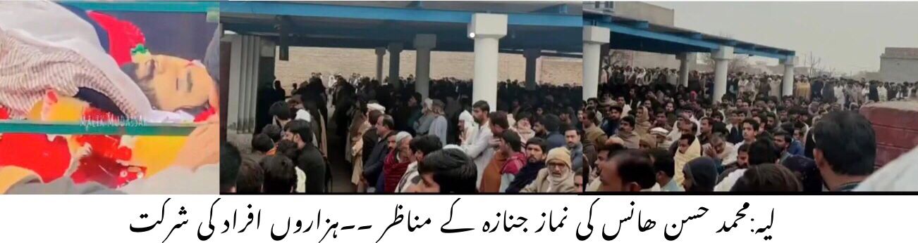 لیہ {صبح پا کستان} انجمن تاجران کے سابق وصدر باروی گروپ کے سربراہ واحد بخش باروی ھانس کے پوتے اور دینی و روحانی اسکالر صاحبزادہ مفتی نعمان قادر مصطفائی ھانس کے کزن حاجی محمد اسمعیل ہانس کے جواں سال بیٹے محمد حسن ہانس جن کو گزشتہ روز گھر کے باہر محلہ ھانس کالونی لیہ میں دن دہاڑے اپنی ہی برادری کے دوستوں نے فائرنگ کرکے قتل کردیاتھا گزشتہ روز ان کی نماز جنازہ ادا کردی گئی نماز جنازہ میں ضلع لیہ کی معتبر ترین سیاسی ؛ دینی روحانی و سماجی شخصیات کے ساتھ ساتھ عوام نے بھی ہزاروں کی تعداد میں شرکت کی مرحوم کی قل خوانی مورخہ 4 فروری بروز بدھ بوقت 11 بجے مسجد لاثانی محلہ ھانسانوالہ لیہ شہر میں ادا کی جائے گی دوسری طرف قاتل ابھی تک مفرور ہیں پولیس کے چھاپے جاری ہیں ڈی پی او کے مطابق جلد قاتل قانون کی گرفت میں ہوں گے قانون کی پامالی پر عوام میں شدید بے چینی بھی پائی جا رہی ہے ضلع لیہ میں قانون و اَمن و امان کی صورت حال روز بروز ابتر ہوتی جارہی ہے۔ آئے روز معمولی باتوں پر قتل و غارت کا بازار گرم کیا جارہا ہے اور ناجائز اسلحہ کی بھرمار عام ہے۔ محلوں میں رات گئے نوجوان لڑکوں کی آوارہ گردی عروج پر ہے جس سے عوام کی زندگی خطرے میں پڑ گئی ہے۔ معزز شہری حلقوں کی طرف سے حکام بالا پر زور دیا جارہا ہے کہ وہ شہر میں امن کی بحالی کیلئے ہنگامی اقدامات کریں اور ناجائز اسلحہ رکھنے والوں کے خلاف شکنجہ سخت کریں۔ انتظامیہ سے خاموشی توڑ کر فوری کارروائی کا مطالبہ کیا جارہا ہے۔