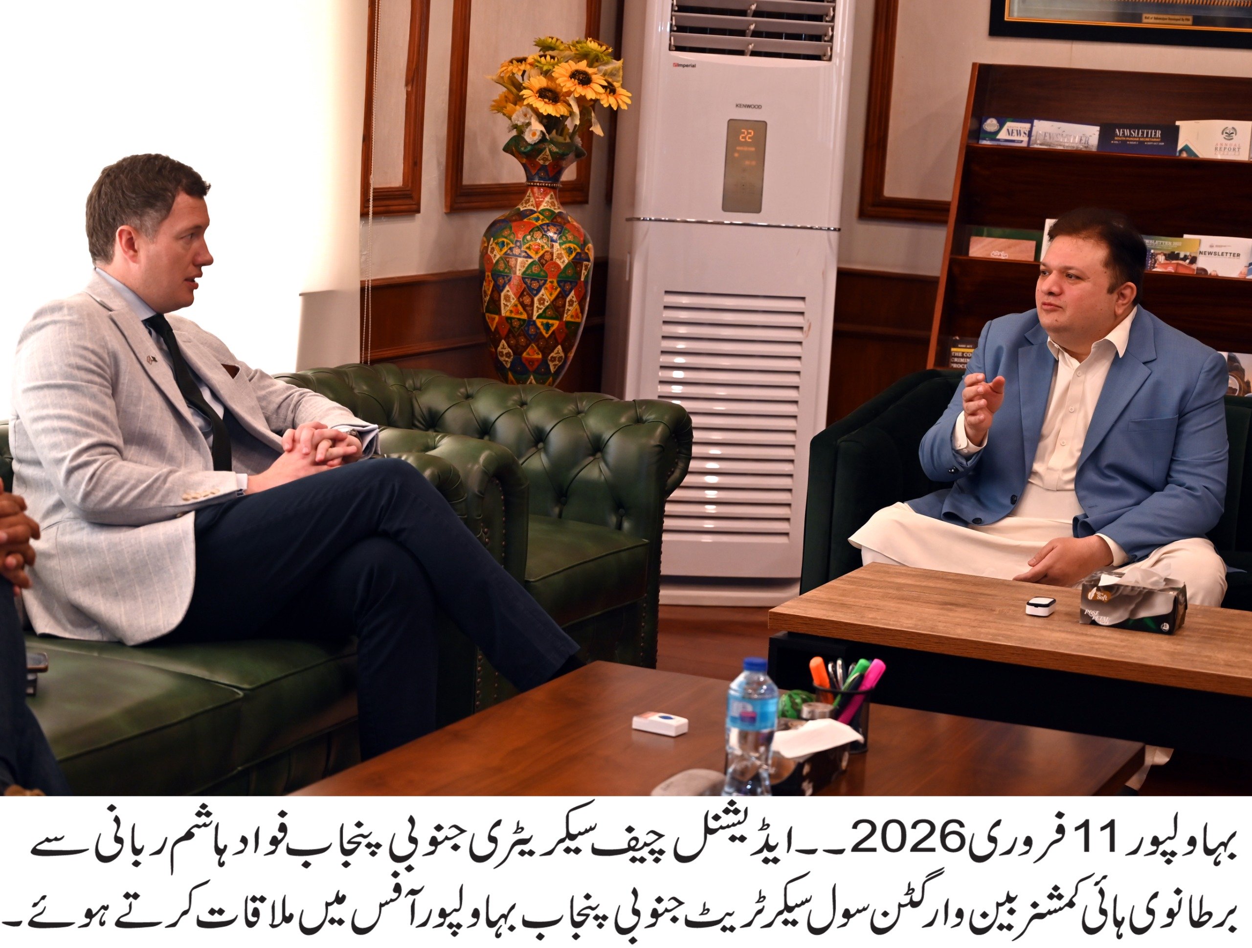 تفصیلات کے مطابق برطانوی ہائی کمشنر مسٹر بین وارگٹن نے اپنی ٹیم کے ہمراہ جنوبی پنجاب سیکریٹریٹ بہاولپور میں ایڈیشنل چیف سکریٹری جنوبی پنجاب فواد ہاشم ربانی سے ان کے دفتر میں ملاقات کی۔ملاقات میں مختلف انتظامی اور باہمی امور کو زیر بحث لایا گیا اورجنوبی پنجاب میں گزشتہ سال کے شدید سیلاب کے اثرات اور کیے گئے ریلیف اقدامات بارے تفصیلی تبادلہ خیال کیا گیا۔ ملاقات میں زراعت، تعلیم، صحت، لائیو اسٹاک اور امپورٹ ایکسپورٹ پوٹینشل کو بھی زیر بحث لایا گیا۔ملاقات میں برطانوی ہائی کمشنر کی جانب سے جنوبی پنجاب سیکریٹریٹ کی عوام الناس کی سہولیات کے لیے موثر کردار کو سراہا اور بہاولنگر میں حلال گوشت کی ایکسپورٹ کے لیے عالمی معیار کے سلاٹر ہاوس بنانے اور گوشت کی پیکجنگ کرنے بارے ایڈیشنل چیف سیکریٹری فواد ہاشم کی حکومت پنجاب کو دی گئی تجویز کی تعریف کی۔ ملاقات کے دوران بات چیت کرتے ہوئے ایڈیشنل چیف سیکریٹری جنوبی پنجاب فواد ہاشم ربانی نے کہا کہ جنوبی پنجاب سیکریٹریٹ کے قیام سے ڈویژنل و ضلعی انتظامیہ سمیت دیگر اداروں کی مانیٹرنگ میں کافی مدد ملی ہے، زرعی شعبہ کی ترقی کے لیے حکومت پنجاب کی جانب سے بہاولپور اور ملتان ایگری مال کسانوں کو ایک ہی چھت تلے موثر سروسز فراہم کر رہے ہیں۔ انہوں نے مزید کہا کہ پنجاب بھر کے تمام اداروں میں الیکٹرانک فائلنگ سسٹم کے مفاد کا آغاز جنوبی پنجاب سیکریٹریٹ سے ہوا، جس سے شفافیت اور جوابدہی کو یقینی بنانے میں بہت مدد ملی ہے۔ انہوں نے کہا کہ جدید تقاضوں کے مطابق ہم آہنگی کے لیے ہمیں نئی نسل کو تعلیم، صحت، جدید نصاب اور مہارتیں فراہم کرنا وقت کی اہم ترین ضرورت ہیں۔