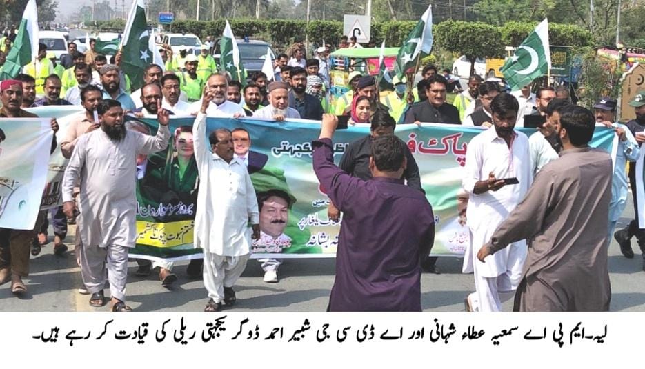 لیہ،کروڑ لعل عیسن( صبح پا کستان ) ضلعی انتظامیہ اور سول سوسائٹی کی جانب سے پاک فوج سے اظہارِ یکجہتی کے لئے ختم نبوت چوک سے کشمیر چوک تک گرینڈ یکجہتی ریلی نکالی گئی۔ ایم پی اے سمعیہ عطاء شہانی، ایڈیشنل ڈپٹی کمشنر جنرل شبیر احمد ڈوگر نے ریلی کی قیادت کی۔ ریلی میں اسسٹنٹ کمشنر کوارڈی نیشن کلیم اللہ خان، ایس ڈی ای او پیرا ام حبیبہ، سی ای او میونسپل کمیٹی شبانہ رشید، صدر انجمن تاجران اظہر ہانس، صدر پریس کلب محسن عدیل، چیئرمین تاجران تنویر احمد خان، جنرل سیکرٹری پریس کلب خالد محمود شوق، سیاسی سماجی شخصیات، افسران، ورکرز، اہلکاروں، میڈیا نمائندگان اور شہریوں کی بڑی تعداد نے شرکت کی۔ شرکاء نے پاک فوج کے حق میں بھرپور نعرے بازی کی اور قومی یکجہتی کا اظہار کیا۔ شرکاء نے پاکستان کی سالمیت اور دفاع کیلئے خدمات انجام دینے والے پاک فوج کے ہیروز کو خراجِ تحسین پیش کیا۔ ریلی کشمیر چوک پر اختتام پذیر ہوئی۔ ایم پی اے سمعیہ عطاء شہانی نے اس موقع پر گفتگو کرتے ہوئے کہا کہ پوری قوم پاک فوج کے ساتھ کھڑی ہے اور ملکی دفاع کیلئے ہر قربانی دینے کو تیار ہے۔ وطن عزیز کی سلامتی اور استحکام کیلئے قومی اداروں کے ساتھ مکمل یکجہتی کرتے ہیں۔ پاک فوج نے ہمیشہ ملک کے دفاع، سلامتی اور استحکام کے لئے بے مثال قربانیاں دی ہیں۔ انہوں نے کہا کہ دہشت گردی کے خلاف جنگ ہو یا قدرتی آفات، ہماری افواج نے ہر مشکل وقت میں قوم کا ساتھ دیا ہے۔ ایڈیشنل ڈپٹی کمشنر جنرل شبیر احمد ڈوگر نے کہا کہ ہم اپنے شہداء اور غازیوں کو سلام پیش کرتے ہیں۔ اس عزم کا اظہار کرتے ہیں کہ پوری پاکستانی قوم اپنی بہادر افواج کے ساتھ کھڑی ہے۔ صدر انجمن تاجران اظہر ہانس نے کہا کہ پاکستان کی سلامتی، استحکام اور ترقی کے لئے مضبوط فوج ضروری ہے۔ صدر پریس کلب محسن عدیل چوہدری نے کہا کہ پاکستان خطہ میں پائیدار امن کا ضامن ہے اور پاک فوج وطن کے دفاع اور سلامتی کے لئے مصروف عمل ہے۔ بعد ازاں ملک کی سلامتی کے لئے دعا کی گئی۔ اسی طرح ضلع کی دیگر تحصیلوں چوبارہ اور کروڑ لعل عیسن میں بھی پاک فوج سے اظہار یکجتی کے لئے ریلیوں کا انعقاد کیا گیا۔