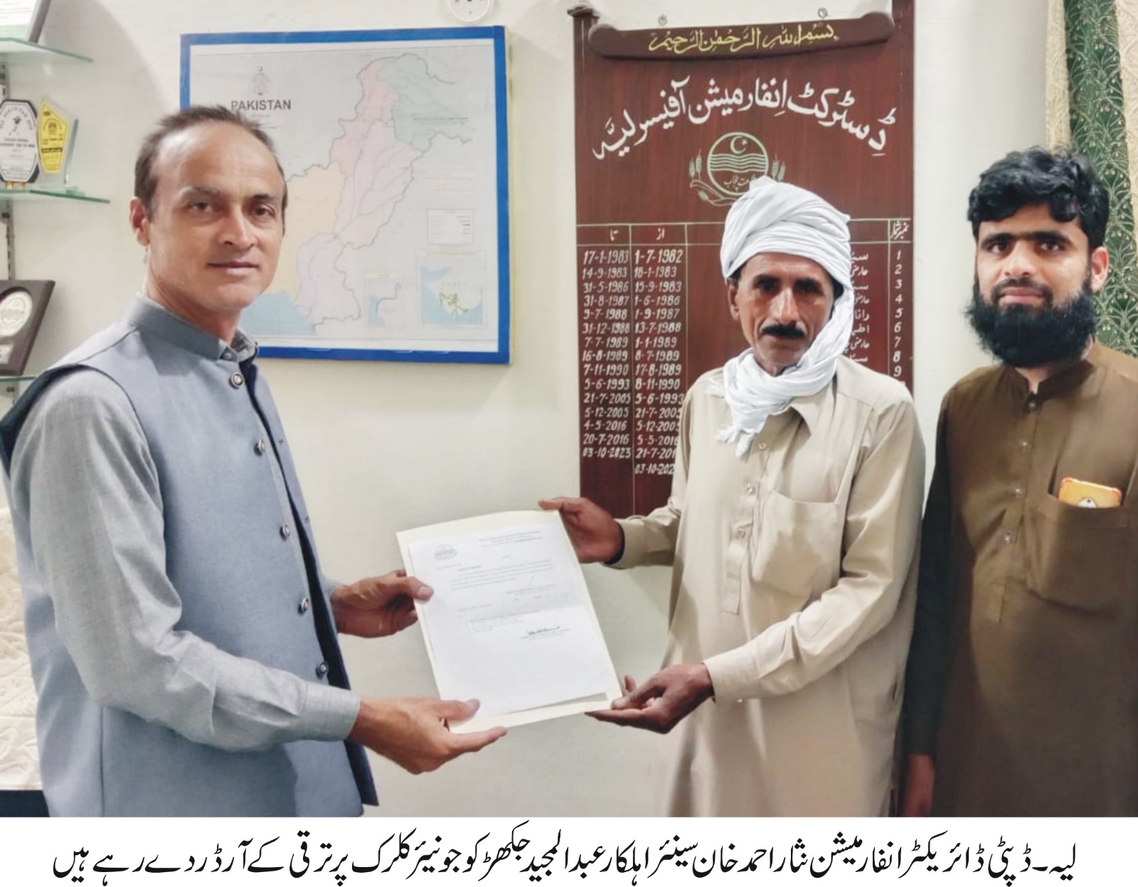 لیہ( صبح پا کستان )ڈسٹرکٹ انفارمیشن آفس لیہ کے سینئراہلکار عبدالمجیدجکھڑ کو جونیئرکلرک کے عہدے پر ترقی دے دی گئی ۔اس ضمن میں ڈائریکٹرتعلقات عامہ ڈی جی خان ڈویژن نے باقاعدہ آ رڈر جاری کردیے۔ڈپٹی ڈائریکٹرانفارمیشن نثار احمدخان نے عبدالمجیدجکھڑ کو جونیئرکلرک کے آرڈ ر دیے اور انہیں ترقی پر مبارک باددی۔